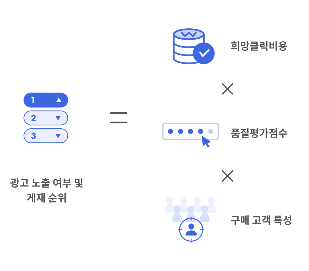 | 노출 상품 및 순위 기준 | 희망클릭비용 x 품질평가점수에 따라 노출 상품과 순위 결정 | 희망클릭비용 x 품질평가점수 x 구매고객특성 구매 고객에 따라 상품 및 순위가 달라질 수 있음 |