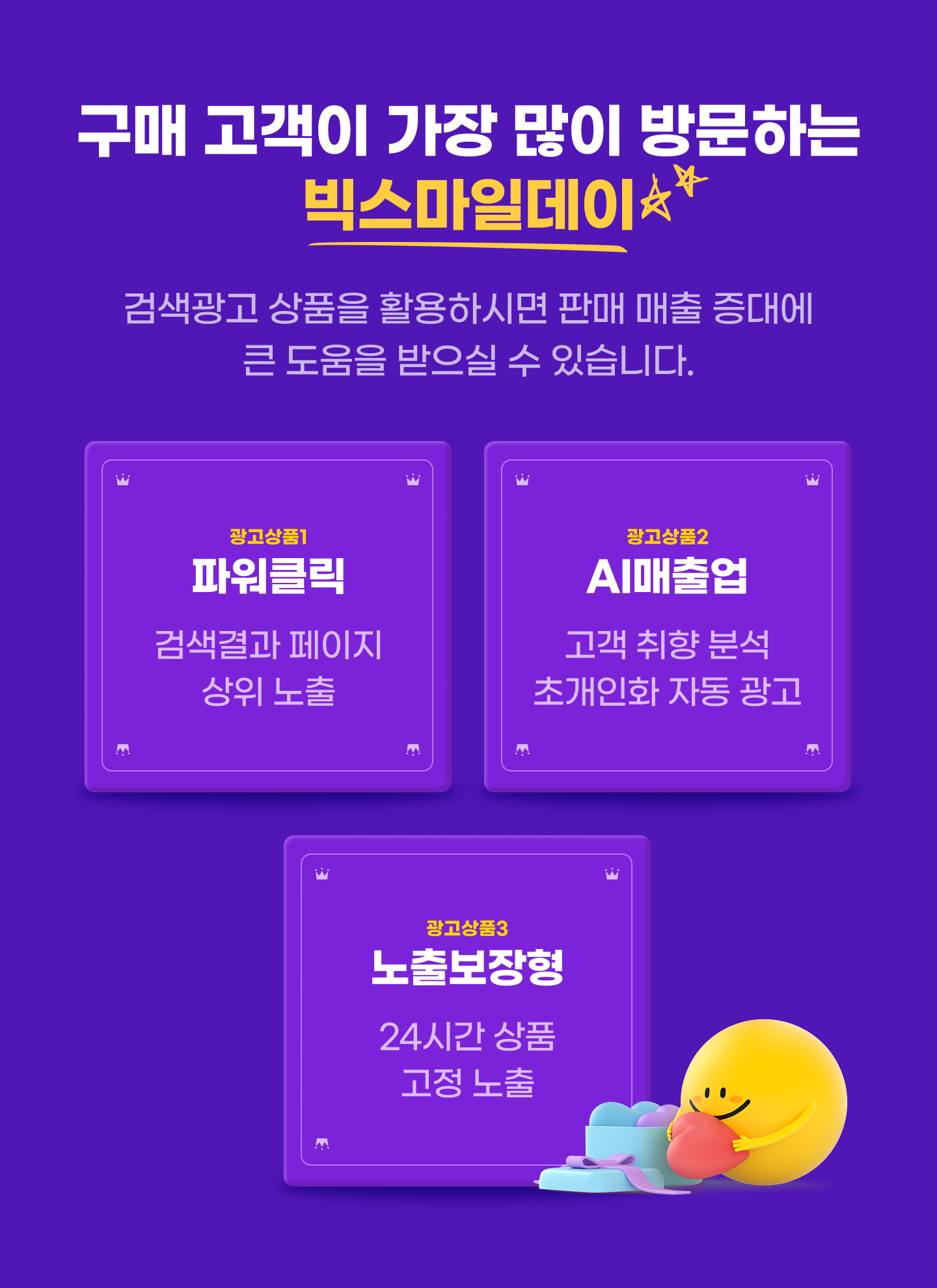구매 고객이 가장 많이 방문하는 빅스마일데이에 검색광고 상품을 잘 활용하시면 판매 매출 증대에 큰 도움을 받으실 수 있습니다!