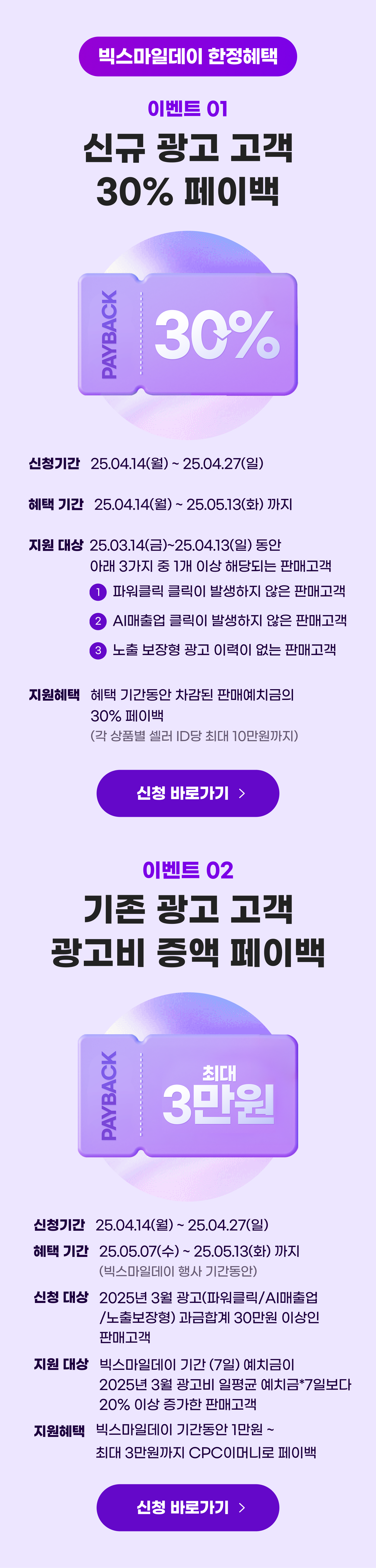 | 지원 금액 | 일반등록 광고비 30% 페이백 상품별 최대 1만원 마스터ID당 최대 100만원 | |